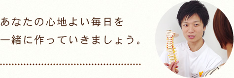 明るく元気に丁寧な治療を行い、治療後は患者様に笑顔になって頂き、「来て良かった!」と言って頂ける、そんな施術を心掛けています。